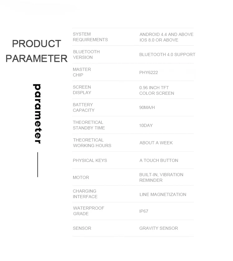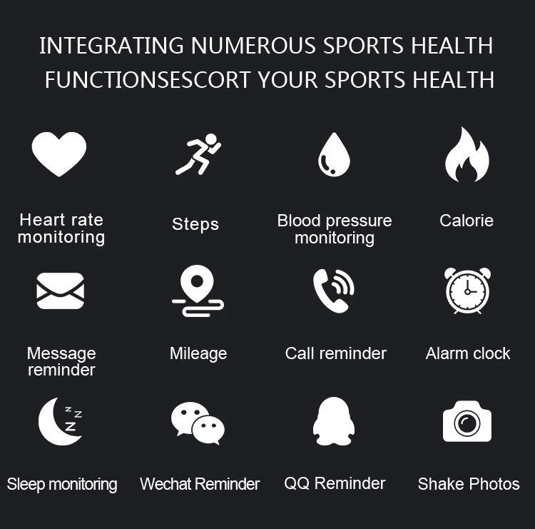Function: Passometer,fitness tracker,sleep tracker,Message Reminder,Call Reminder,Push Message,Blood Pressure,Social Media Notifications,Blood Oxygen,Heart Rate Tracker