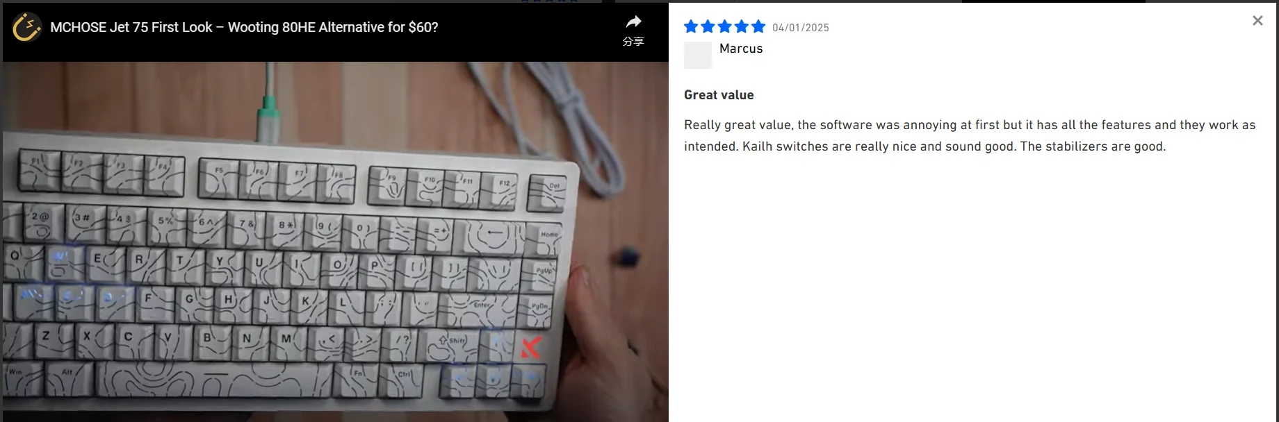 The JET75 is equipped with the upgraded MCHOSE web driver, offering effortless customization of performance settings, lighting effects, onboard memory, and hotkeys.